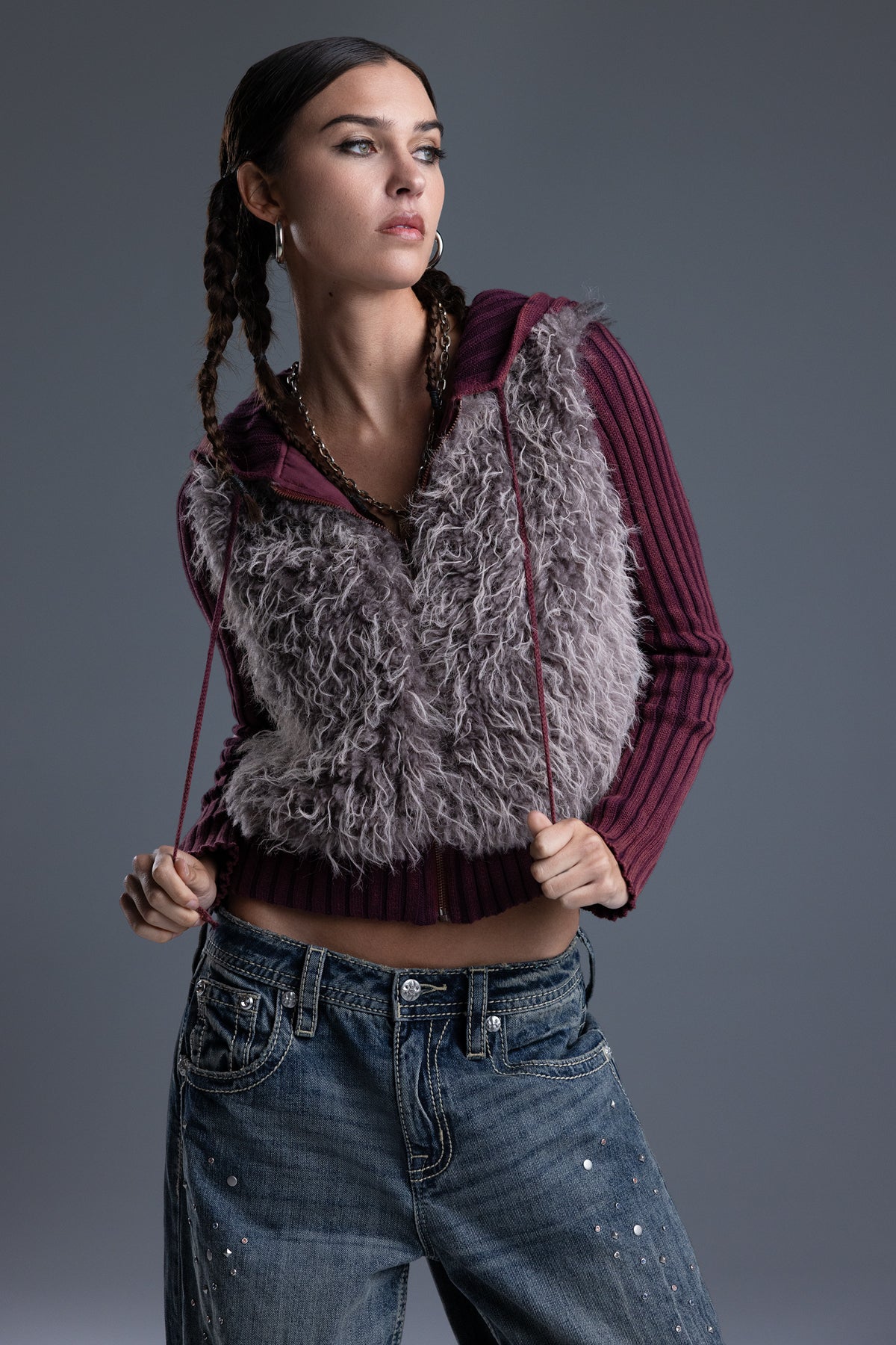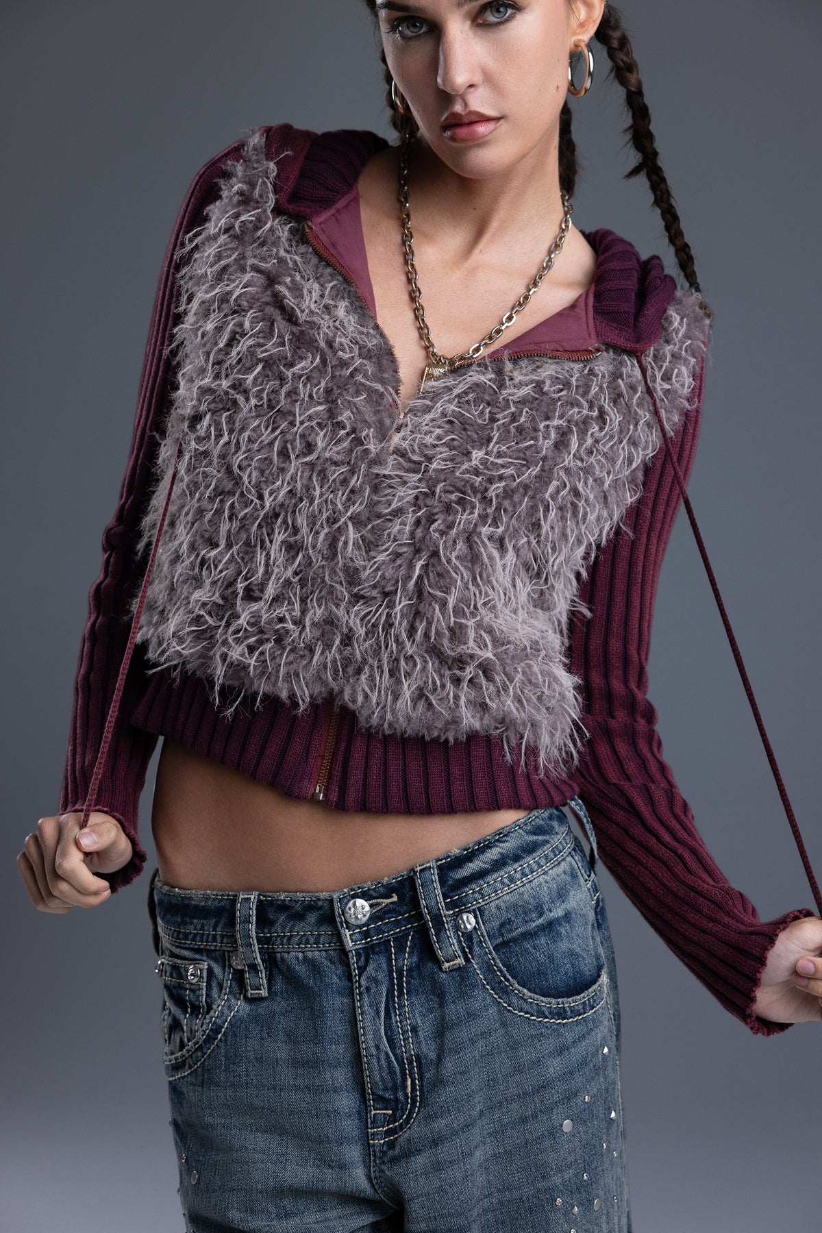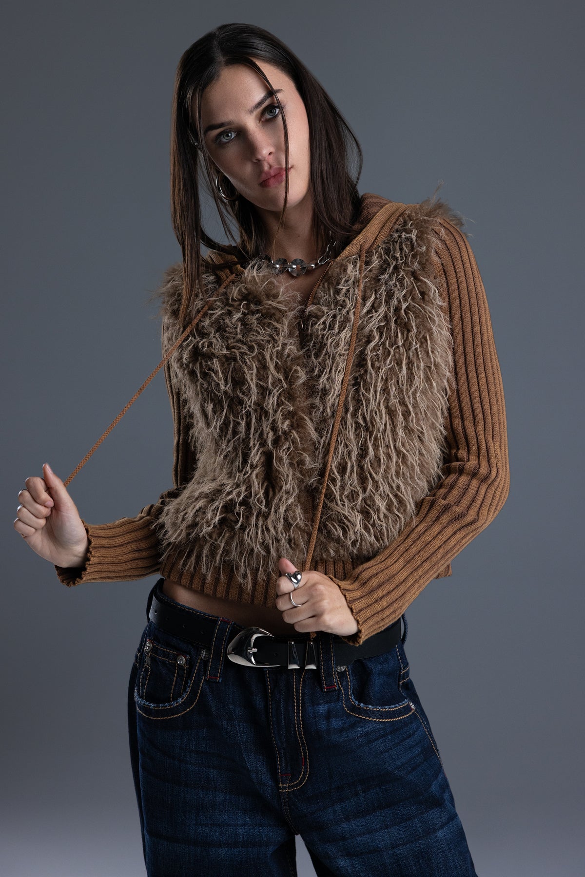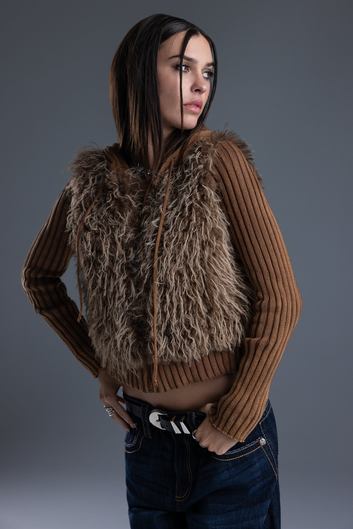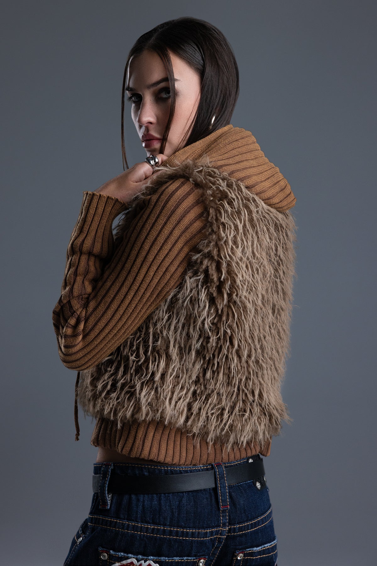 - Soft, shaggy faux fur front panel design