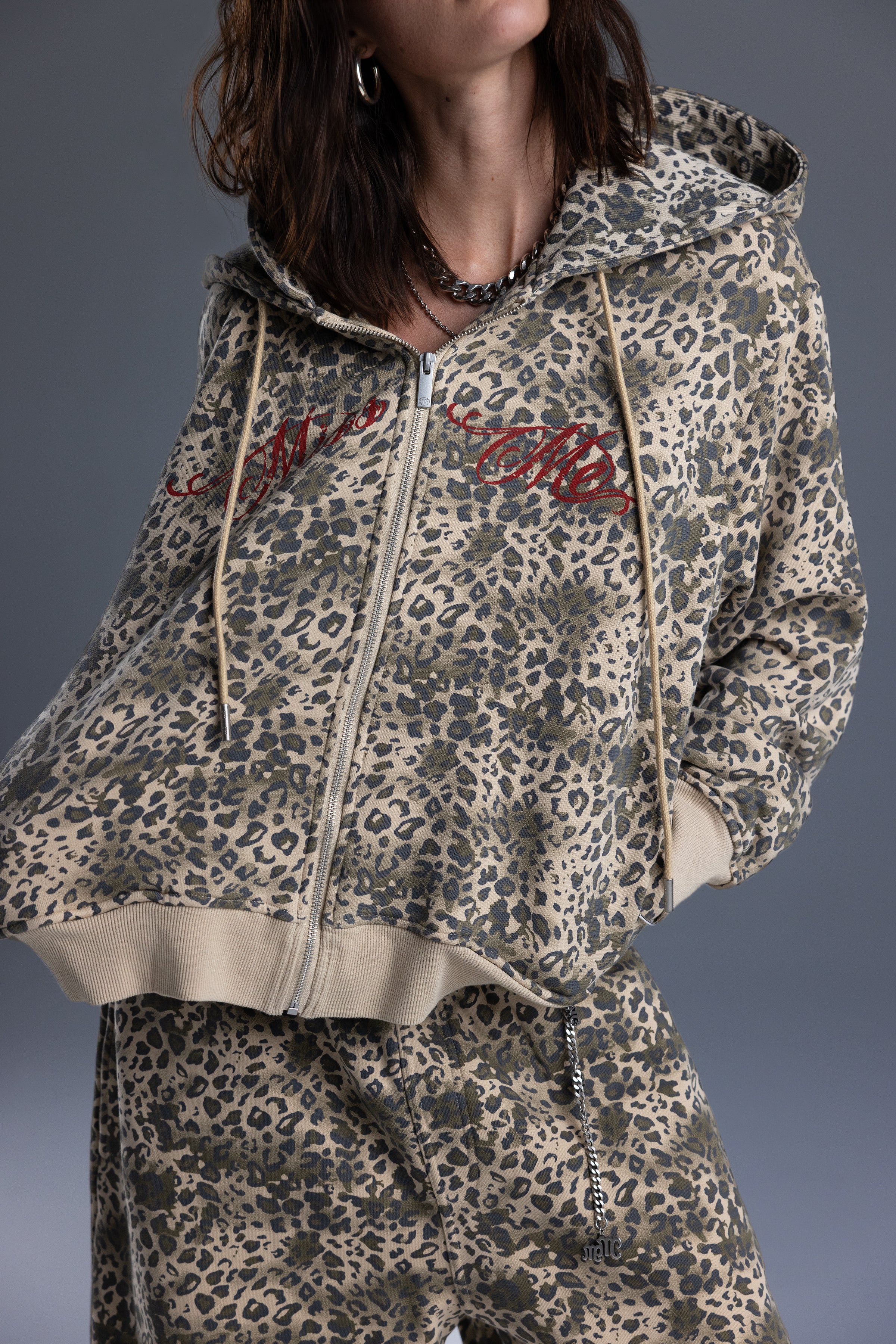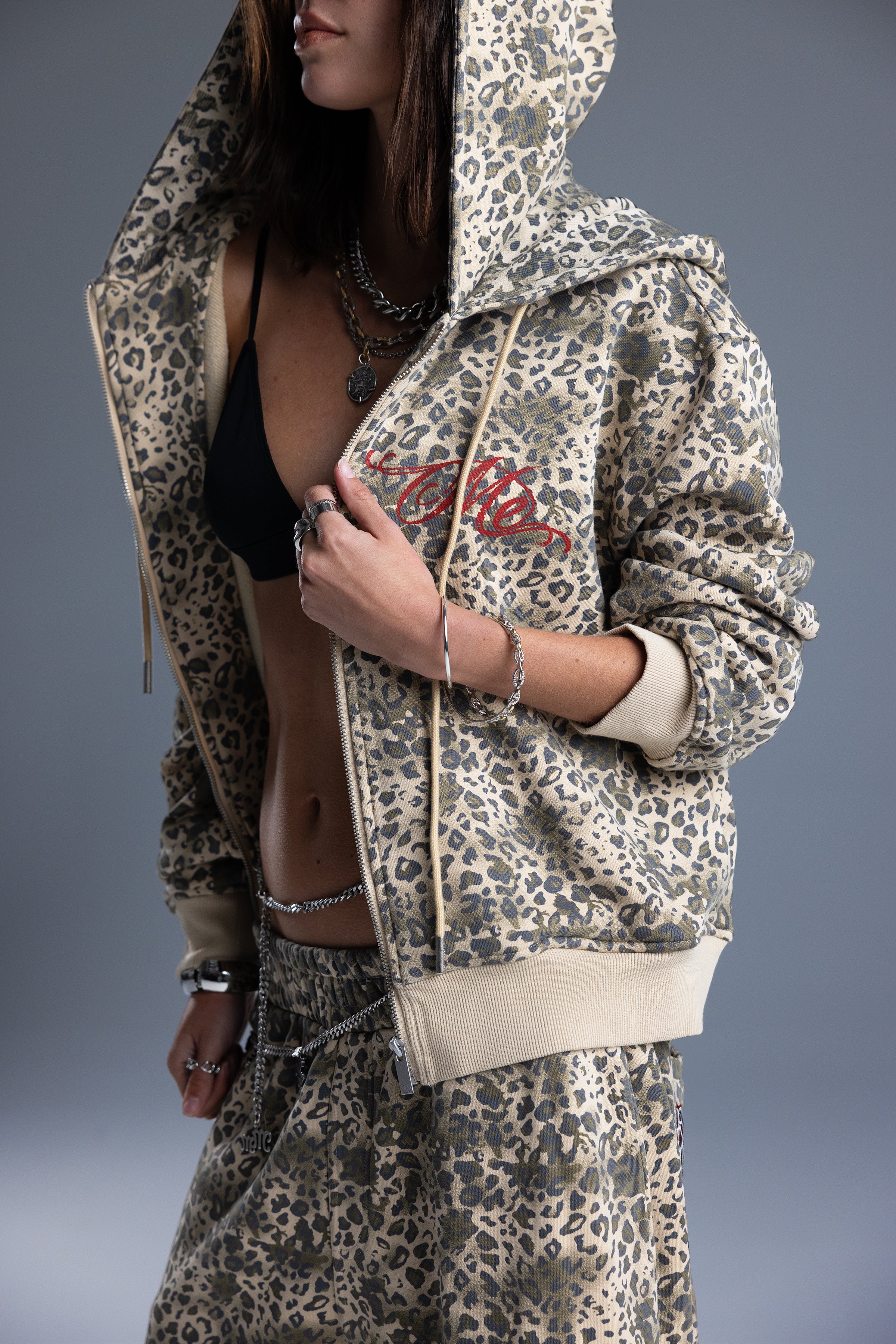 Zip-up double hoodie with leopard print design