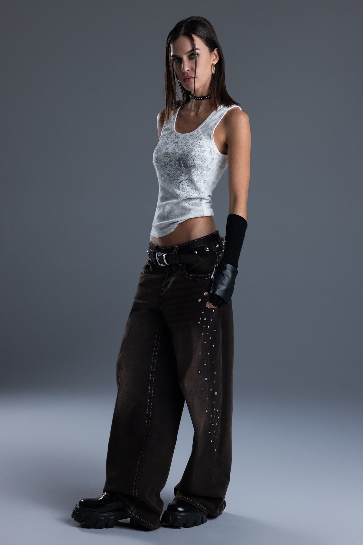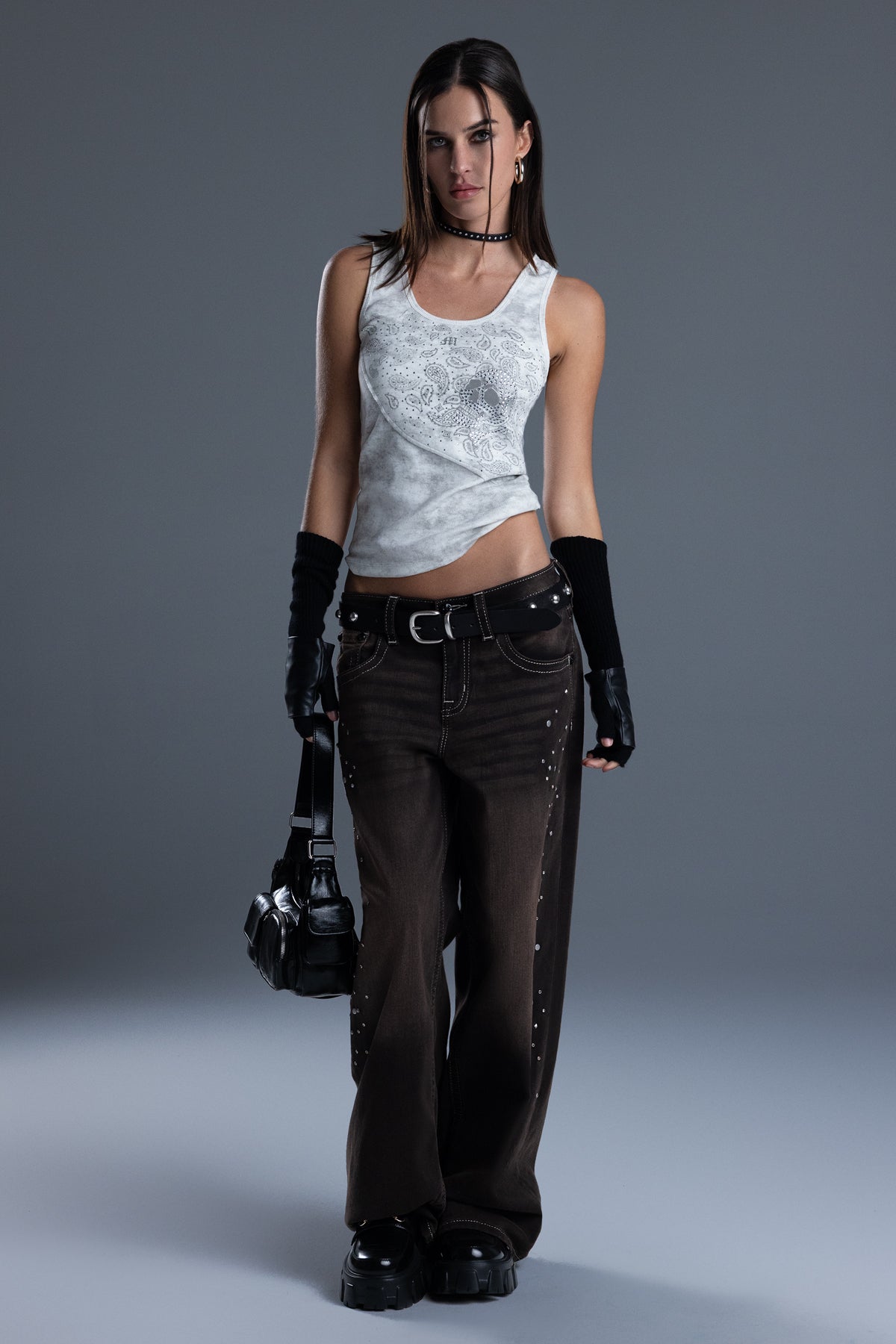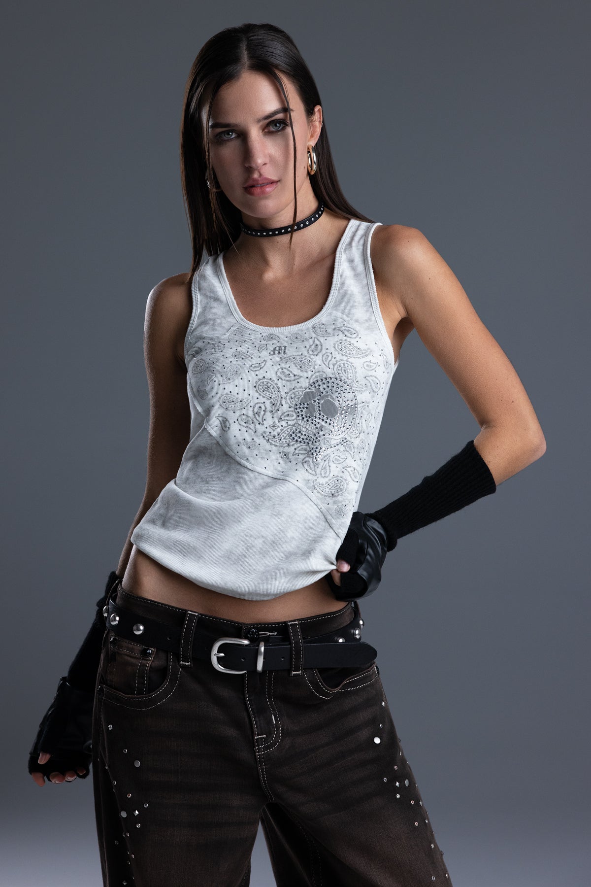 - Skull and paisley graphic embellished with rhinestone details