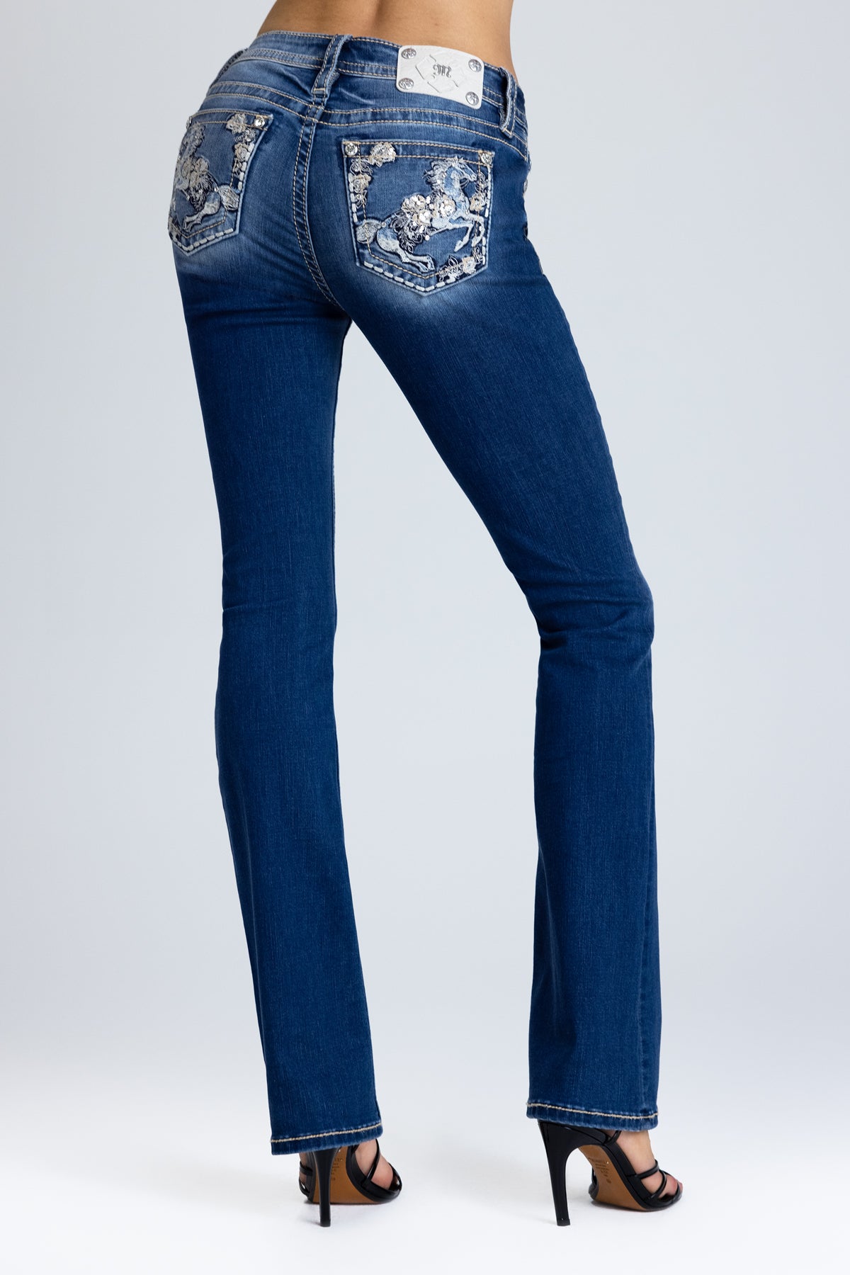 - Embossed studded white leather cross Miss Me brand patch