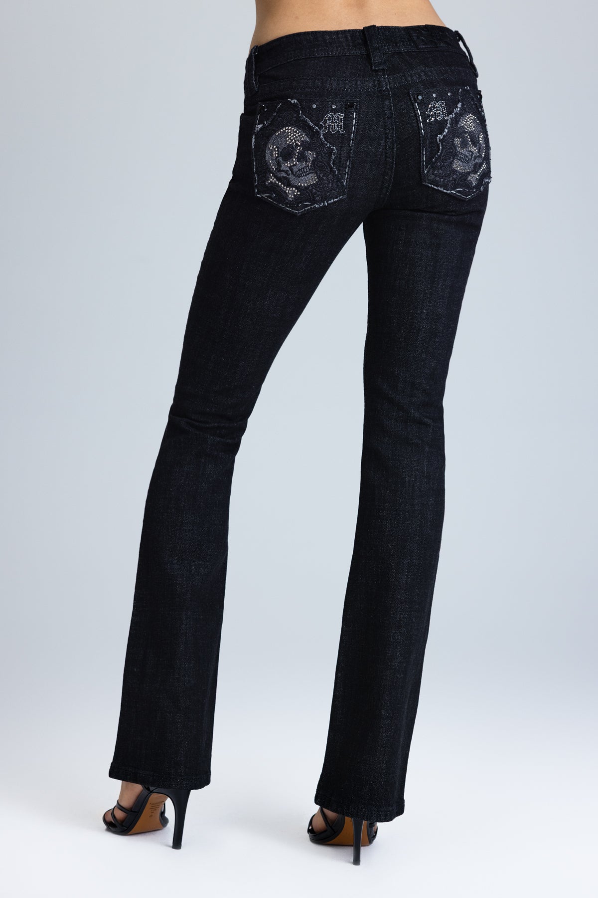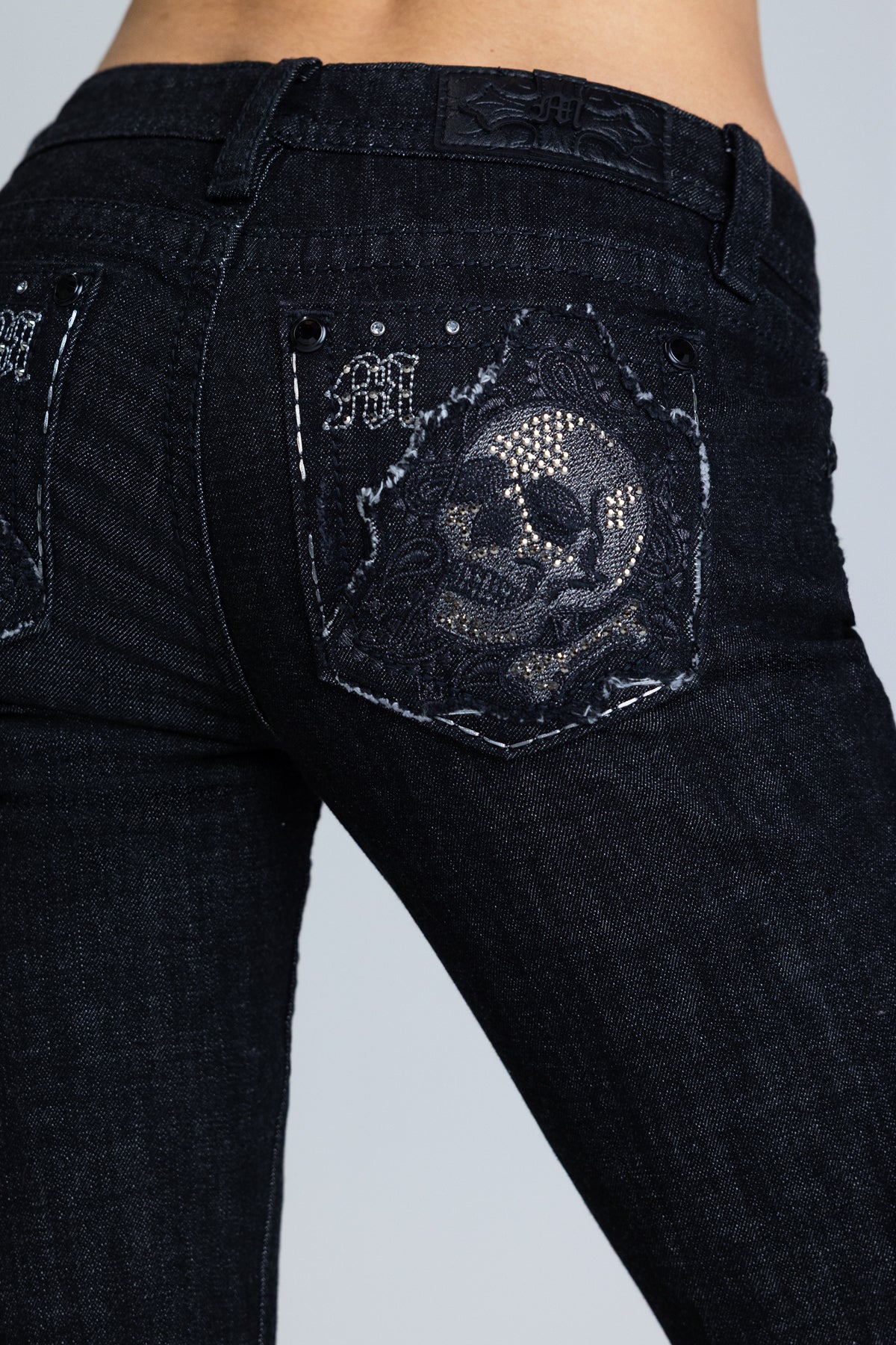 - Embroidered skull graphic with studded accents and filigree patterns