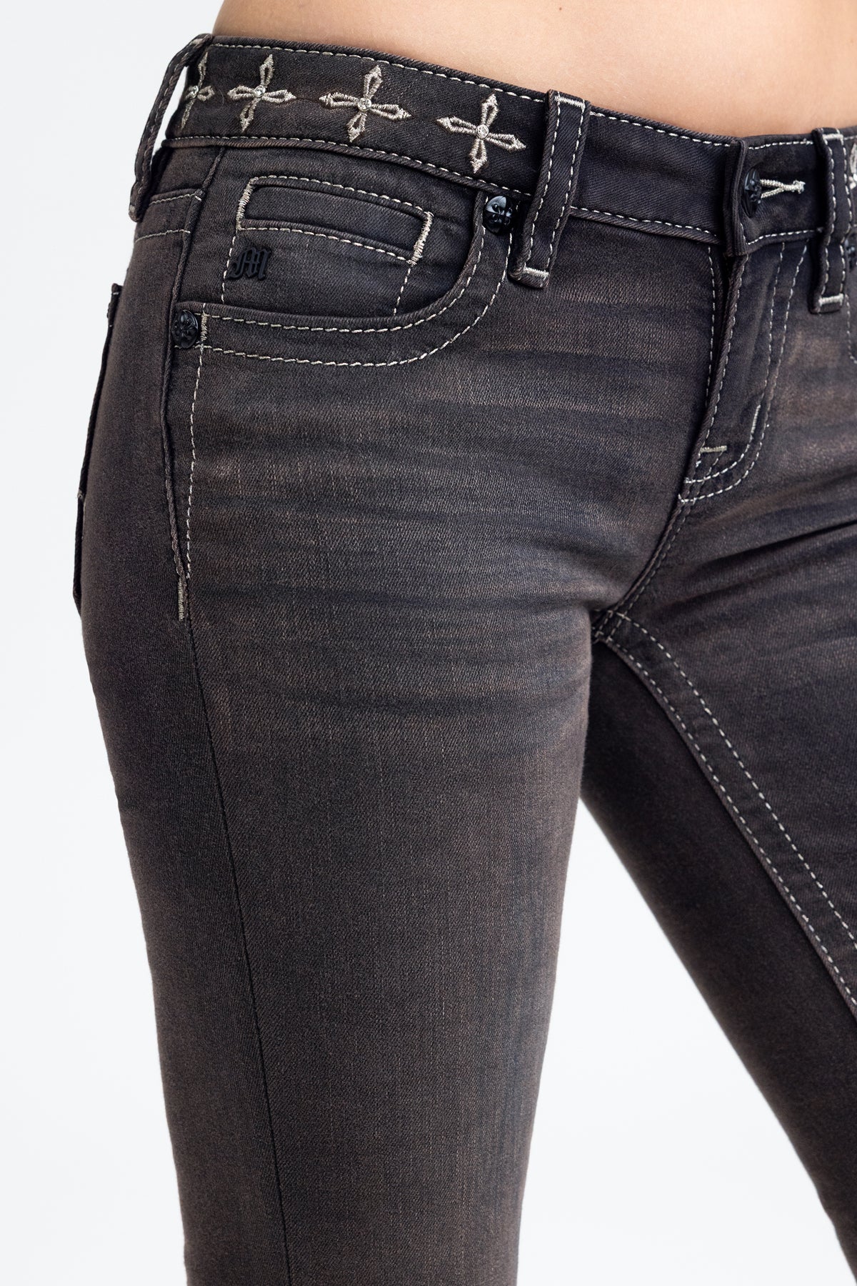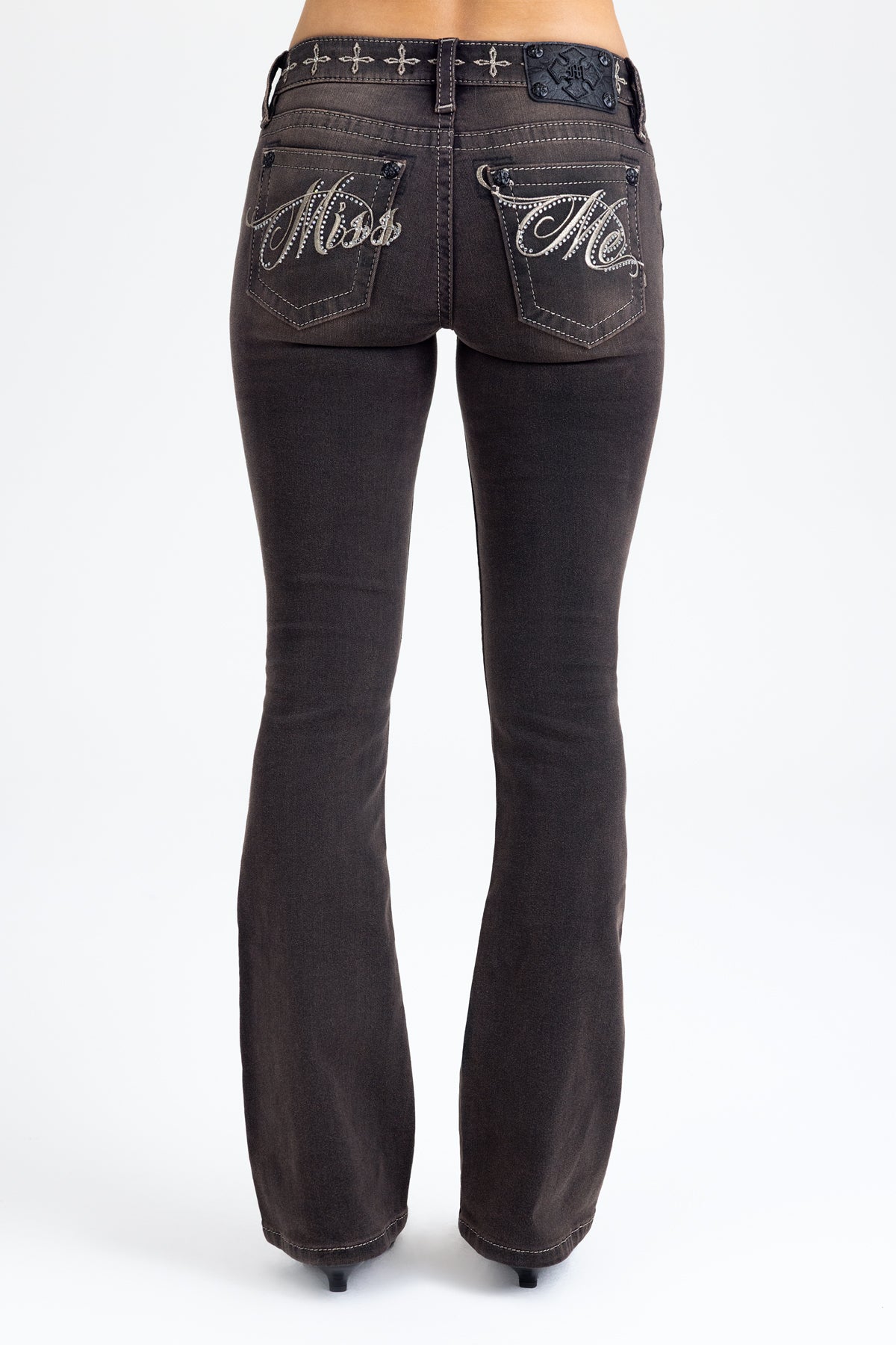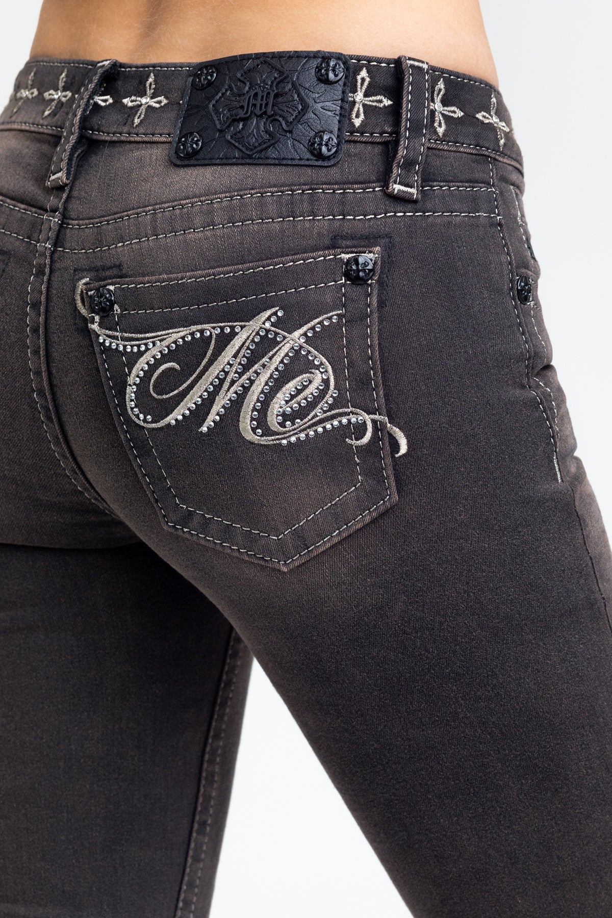 - Embossed black studded leather cross Miss Me brand patch