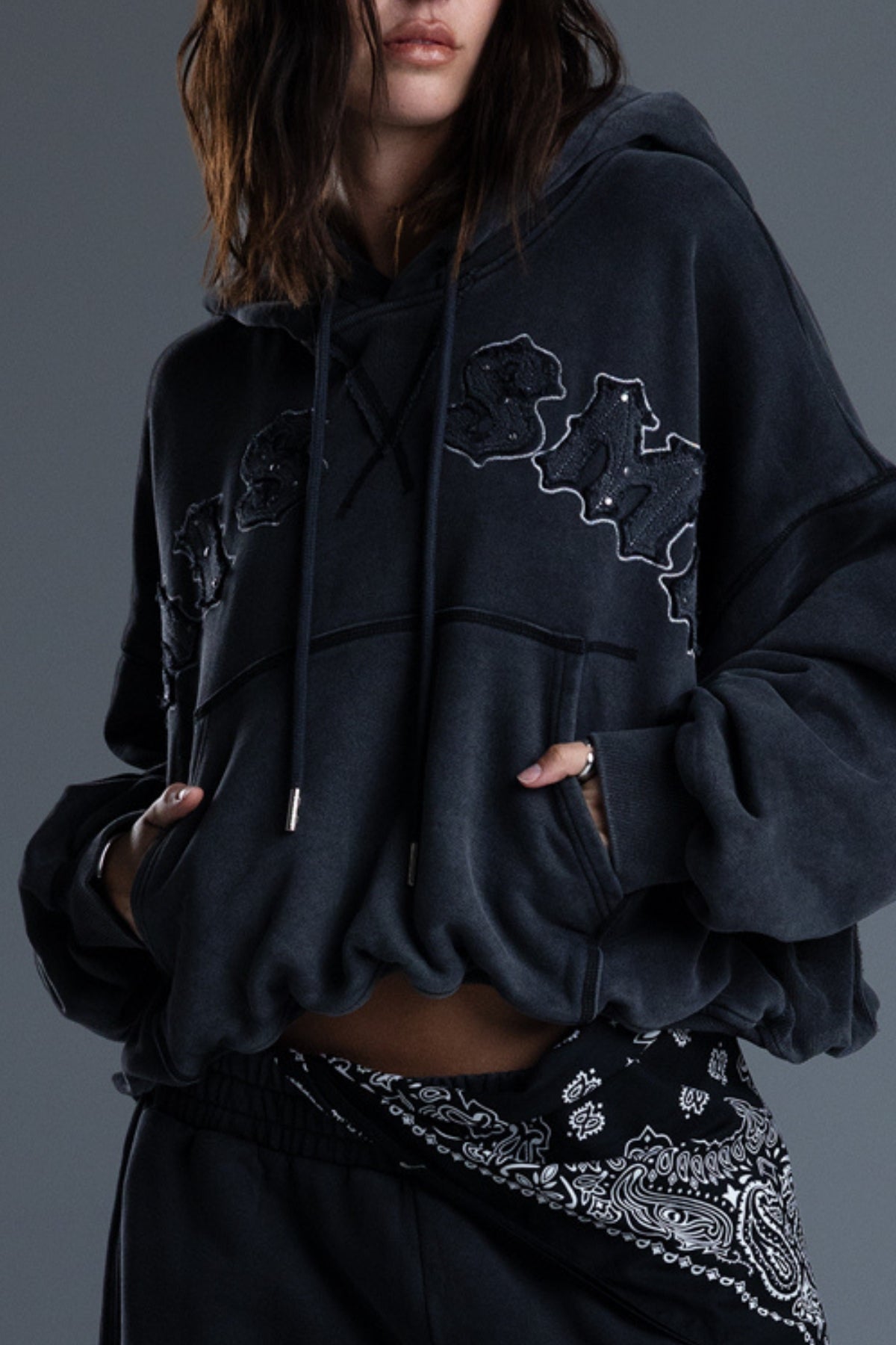 - Embroidery, stud and rhinestone rivet accents