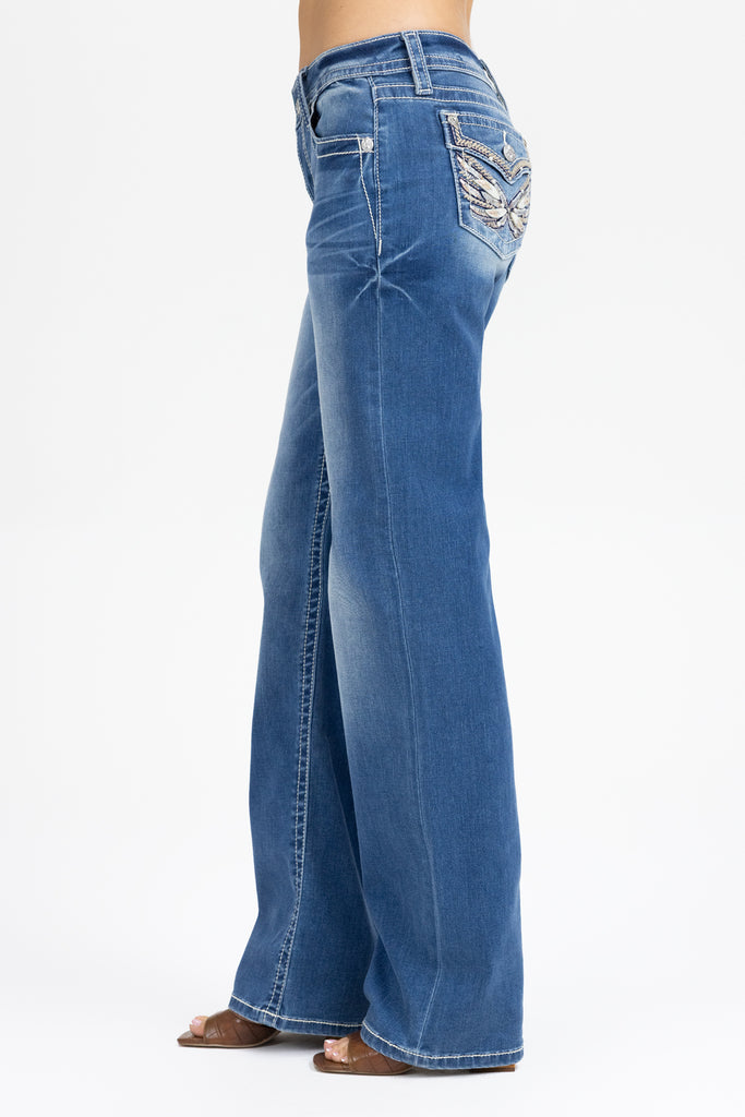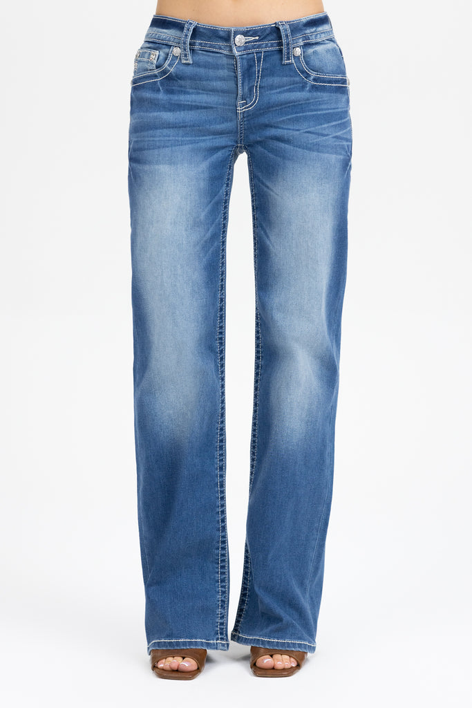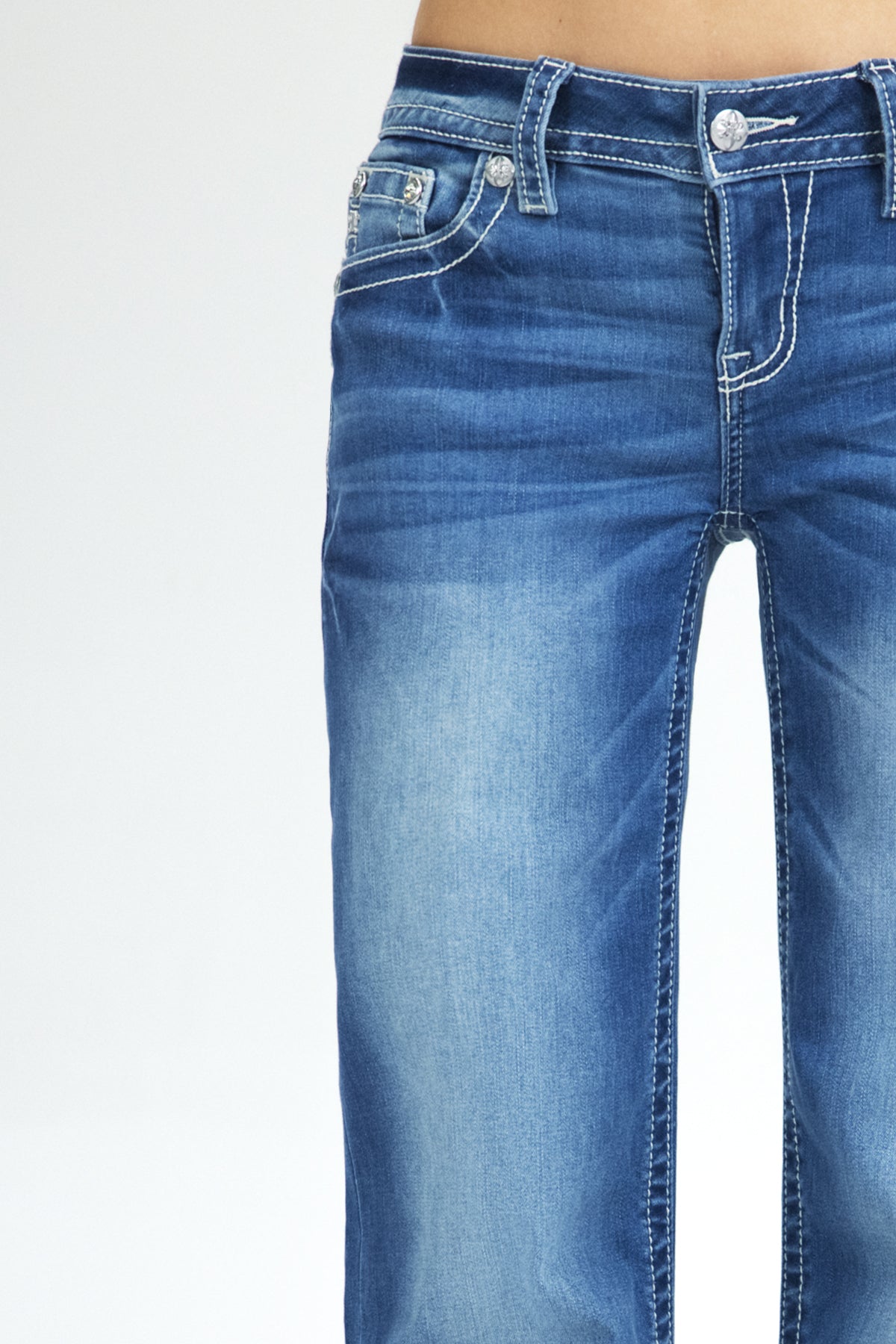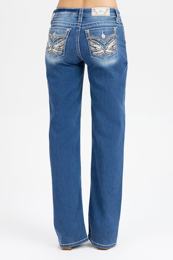 - Embossed white leather wing Miss Me brand patch with matching embroidery