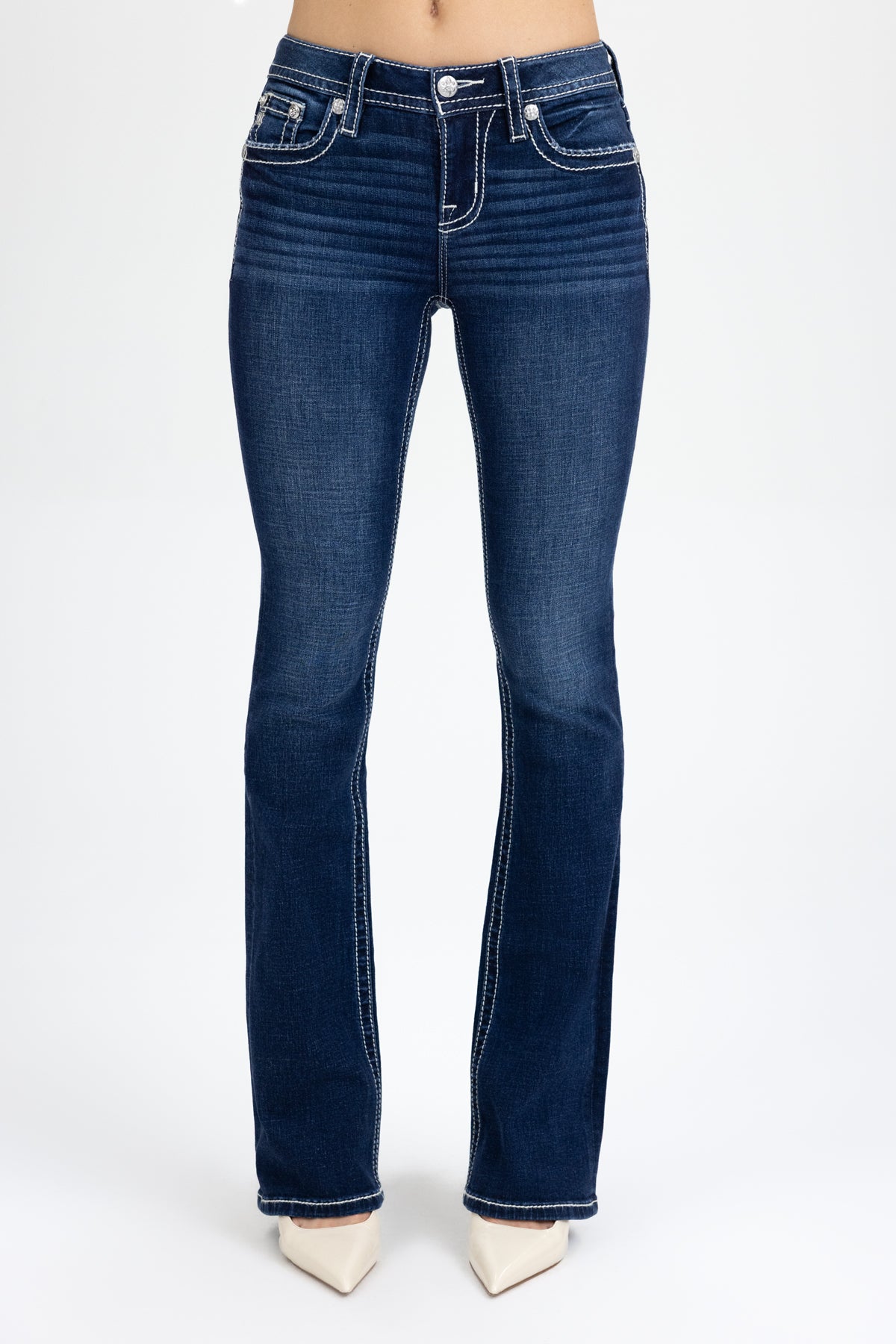 - Embossed white leather cross Miss Me brand patch