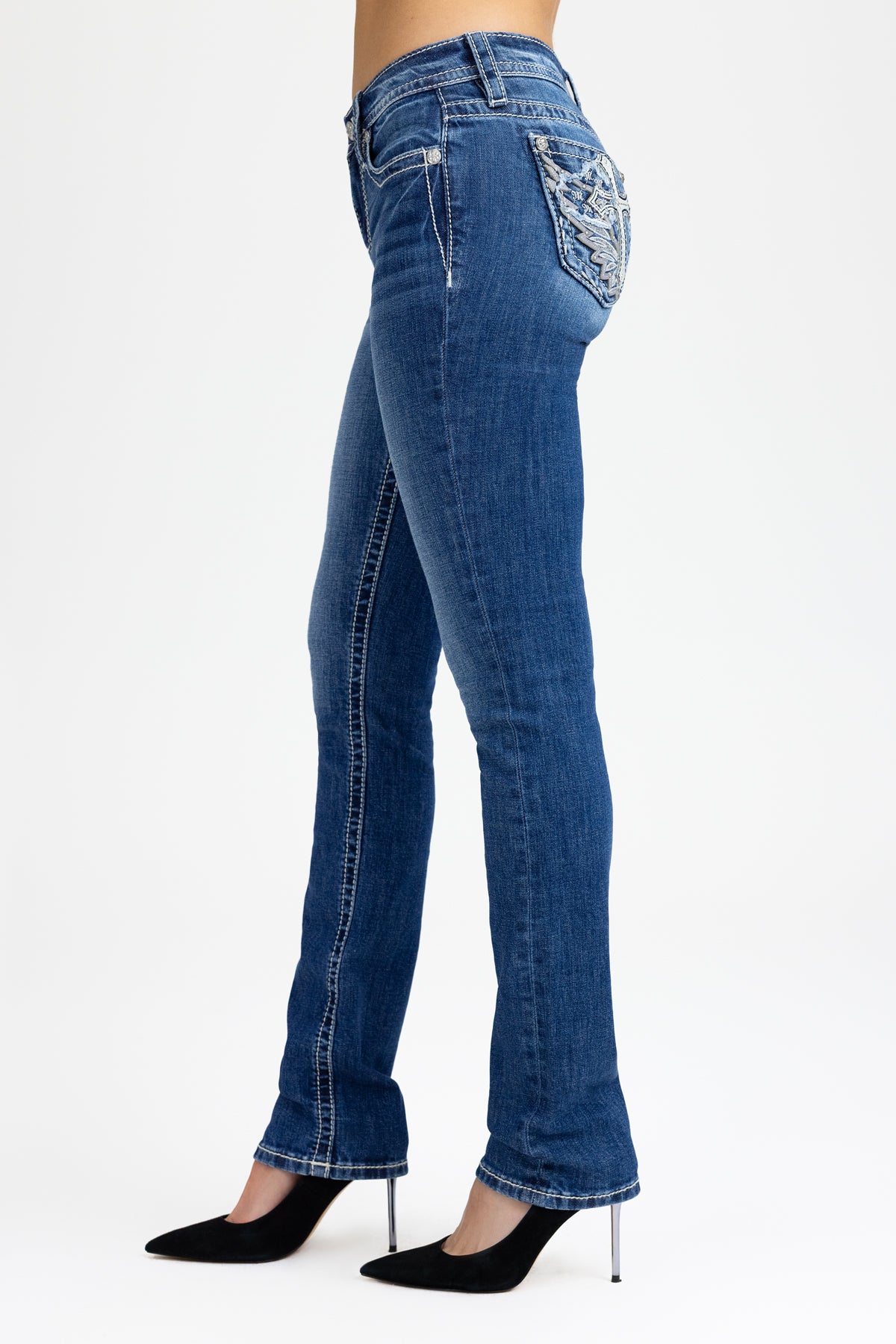 - Embossed white studded leather cross Miss Me brand patch