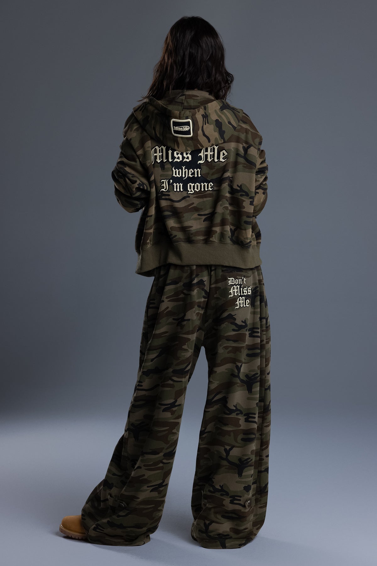 - Embroidered gothic "Don't Miss Me" graphic