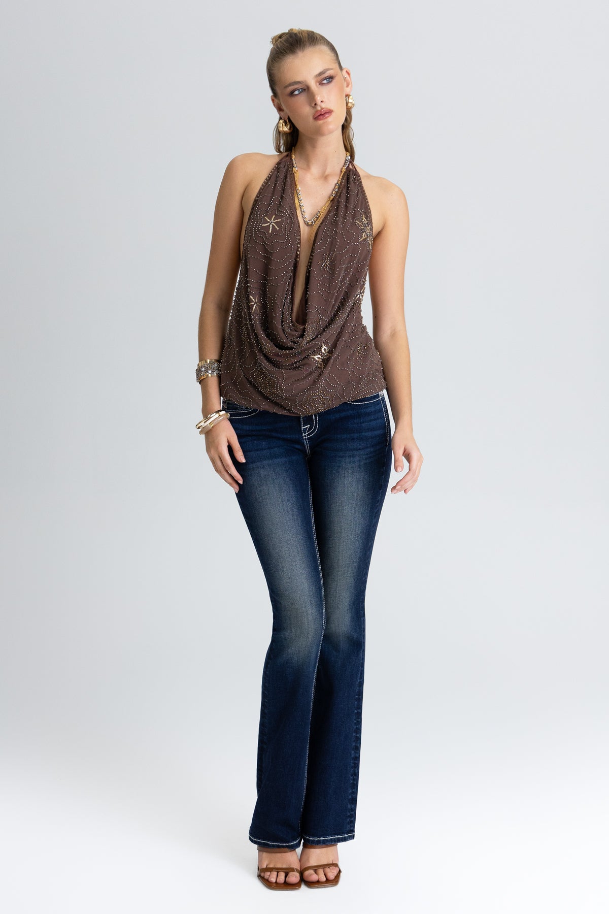 - Rhinestone-studded leather appliqué accents