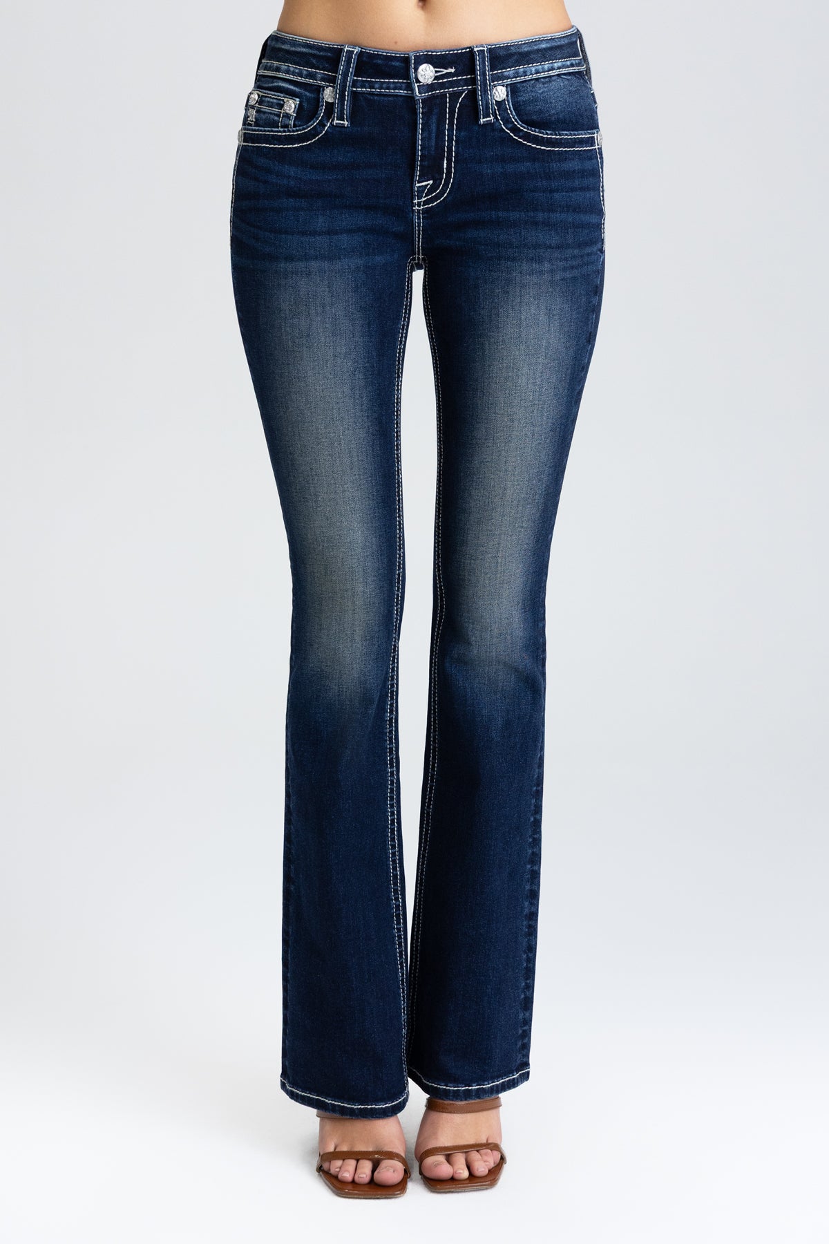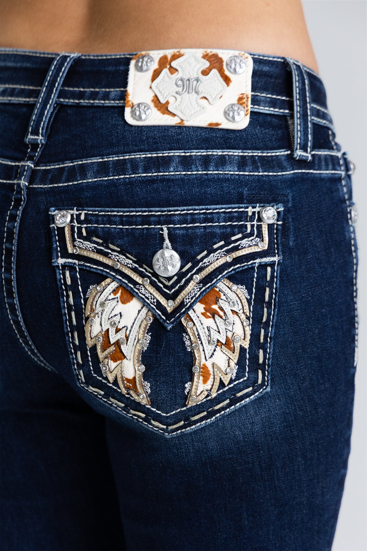 - Embossed white studded leather cross faux cowhide Miss Me brand patch