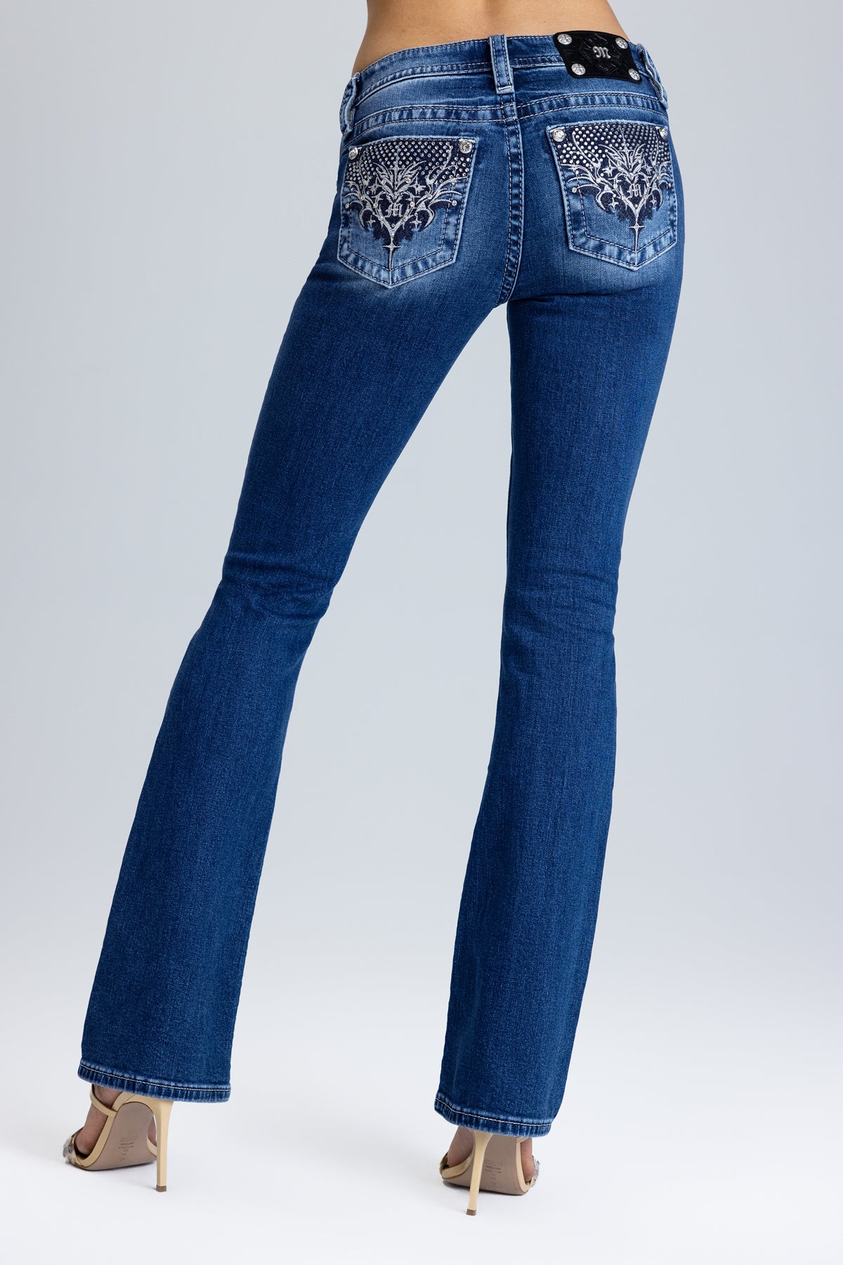 - Studded rhinestone and rhinestone rivet accents