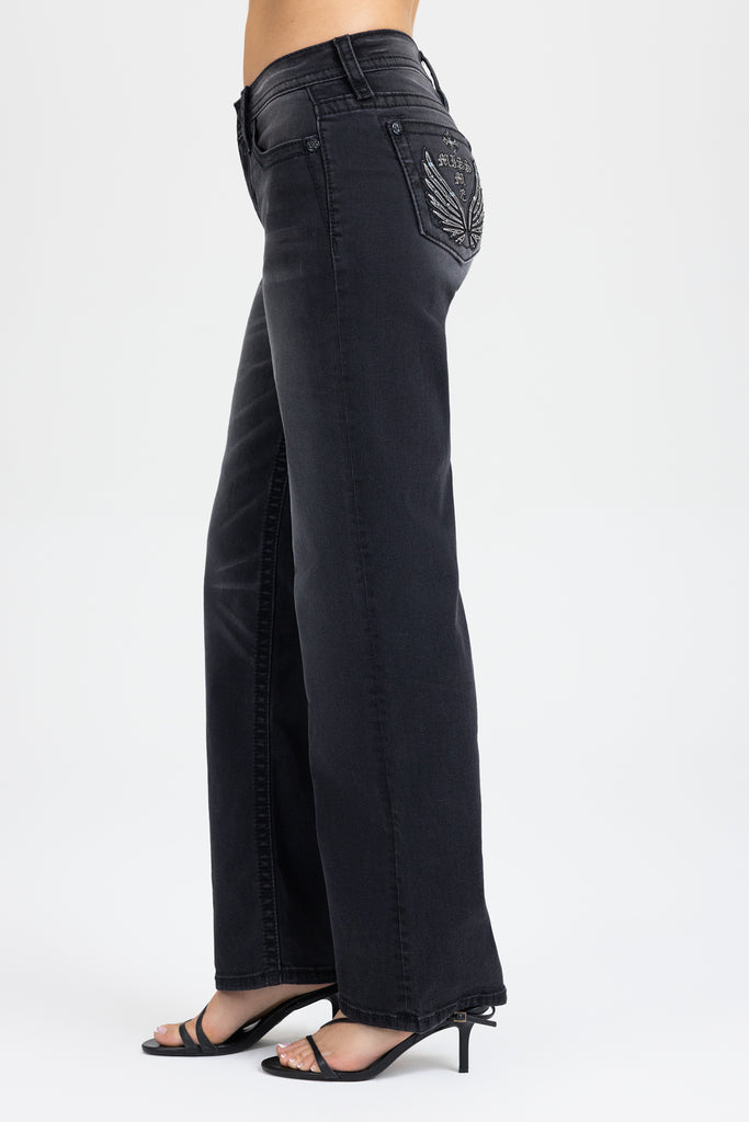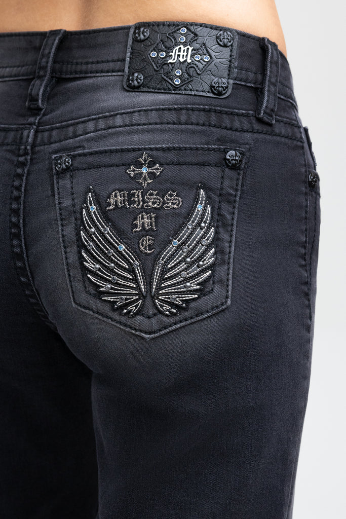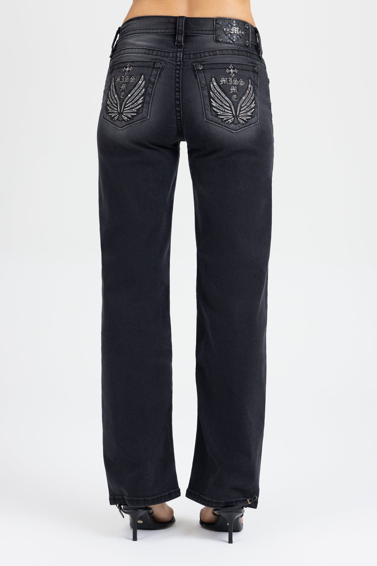 - Embossed black studded leather cross Miss Me brand patch