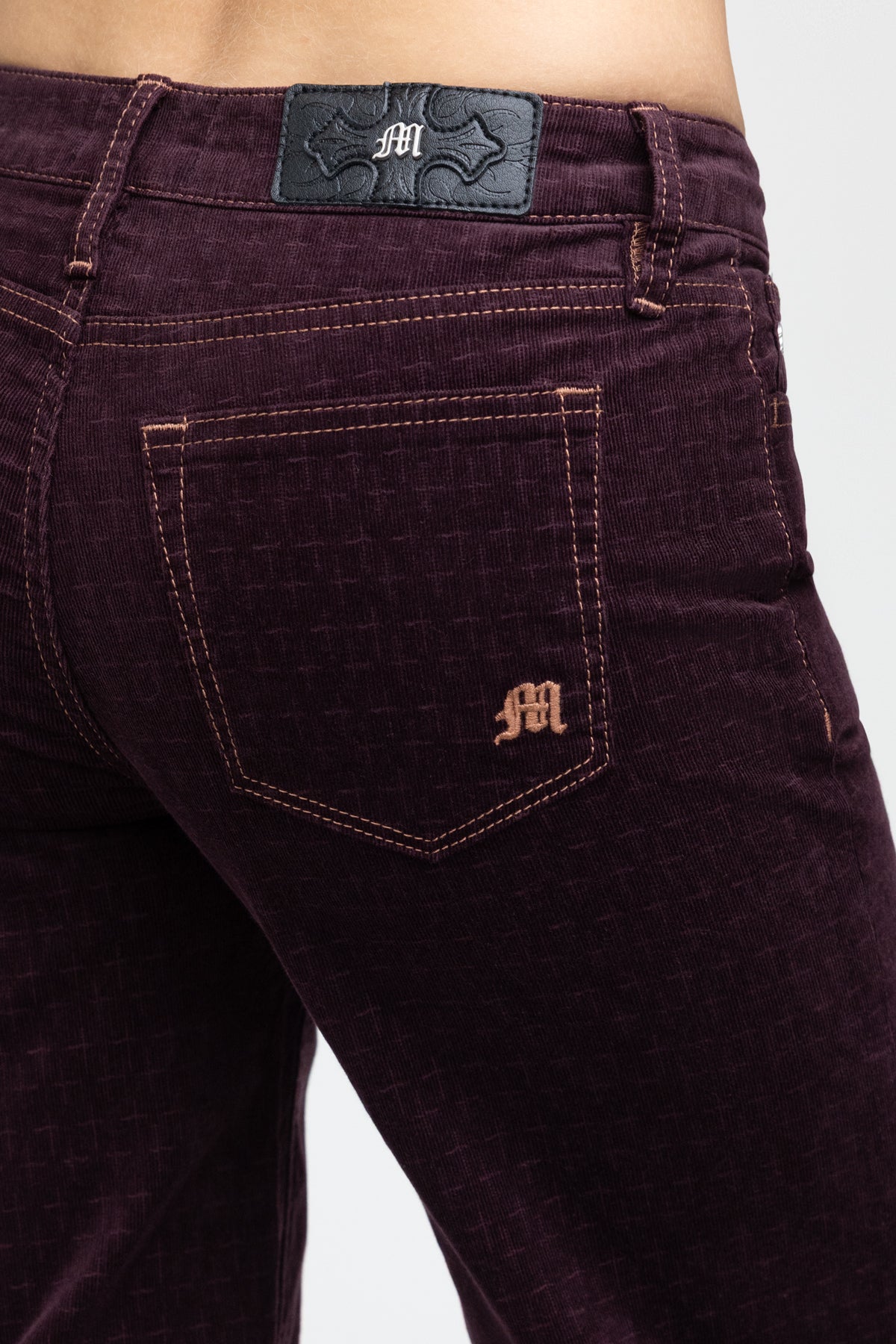 - Embossed black leather cross Miss Me brand patch